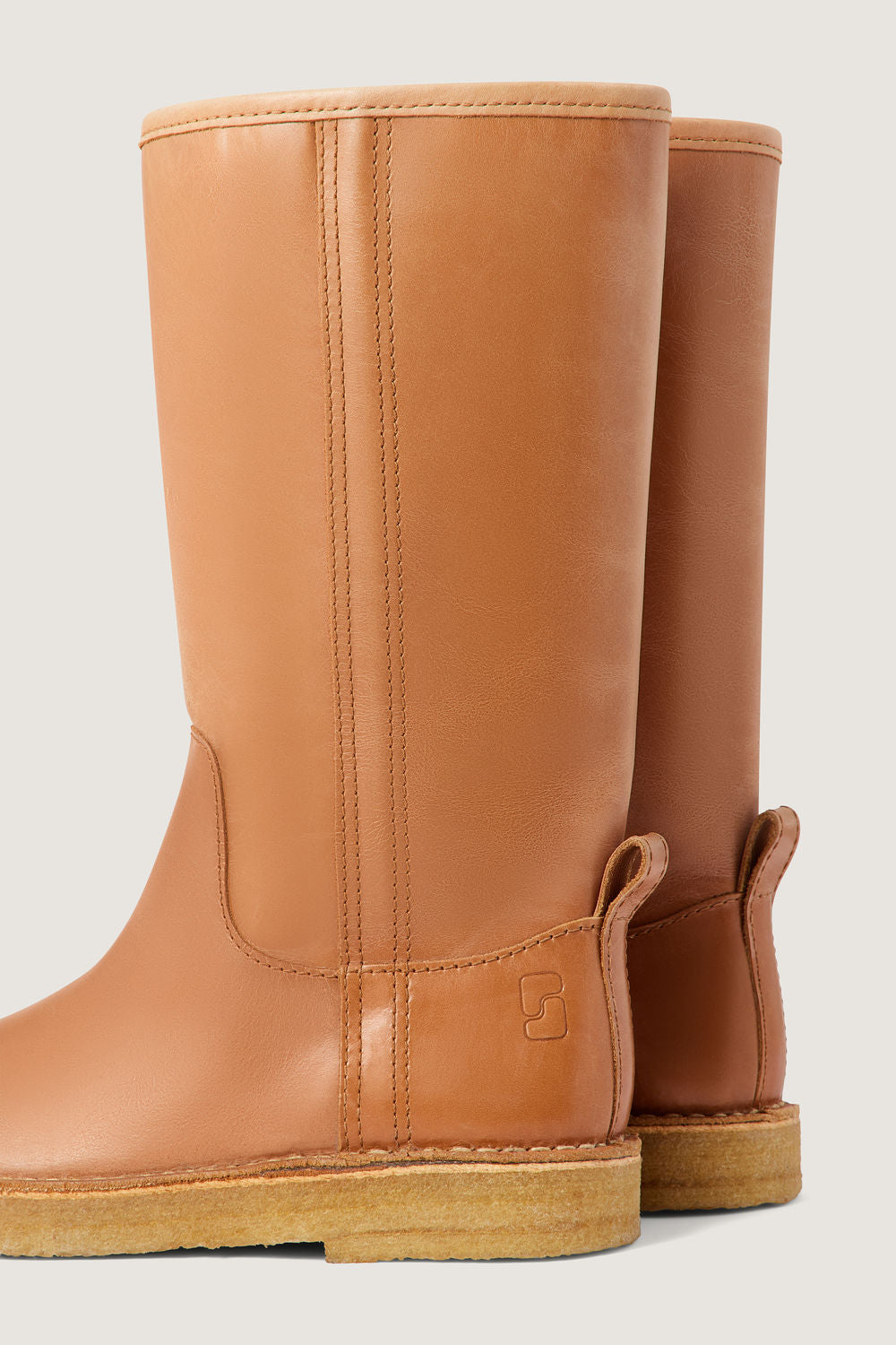 Bottes en cuir cognac - Bottes droites larges à enfiler- Semelle de crêpe épaisse- Hauteur de tige 30cm- Hauteur de talon 3cm- Cuir LWG