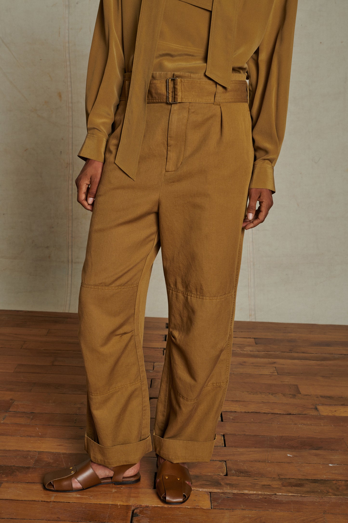 Pantalon inspiration "cargo" en toile de coton et lin souple bronze